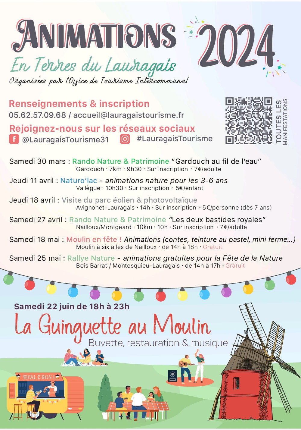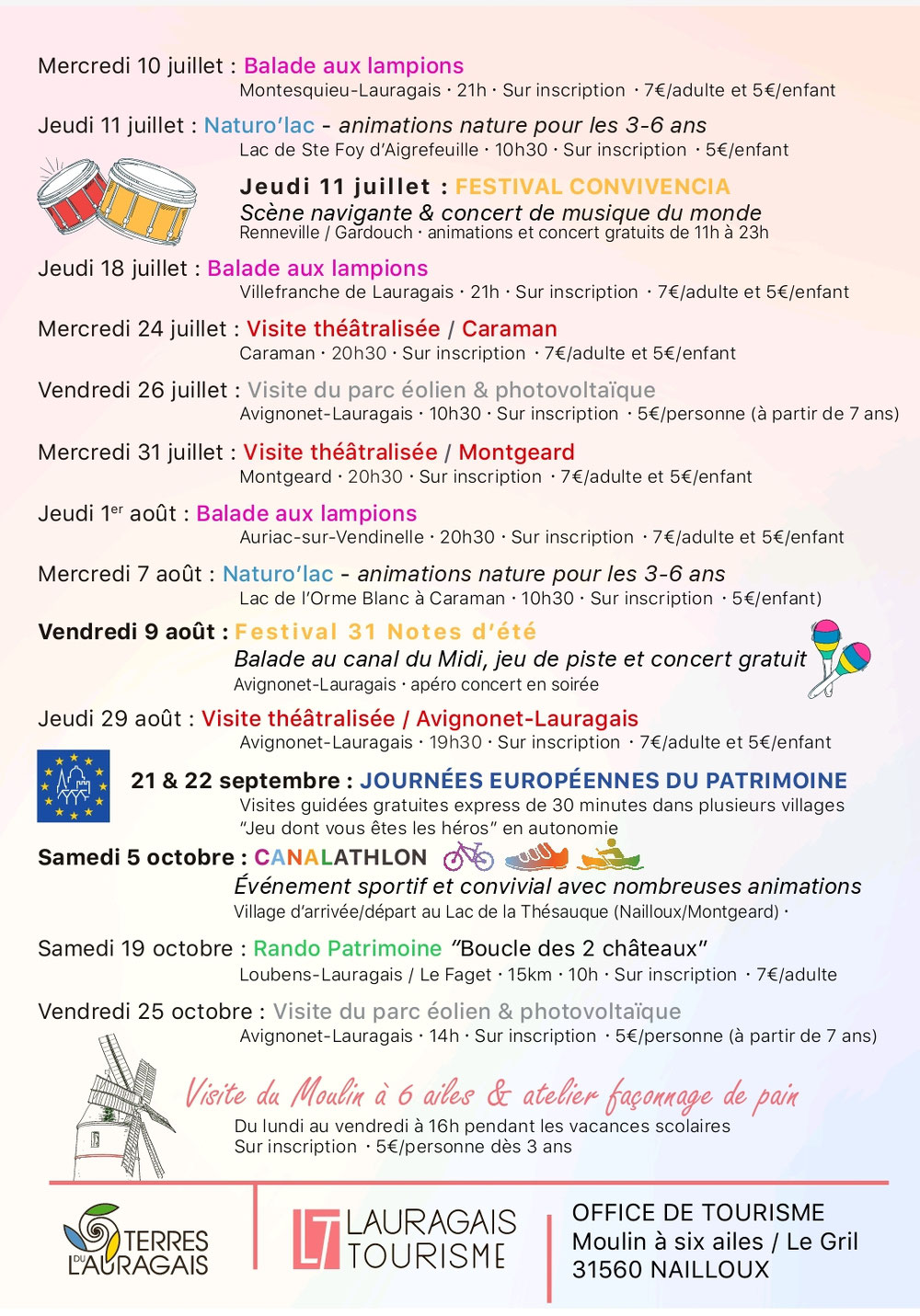 04. mars 2024 Programme des Animations 2024 Voici le programme des animations de la saison 2024 (printemps été automne), organisées par notre office Lauragais Tourisme. tagPlaceholderCatégories :